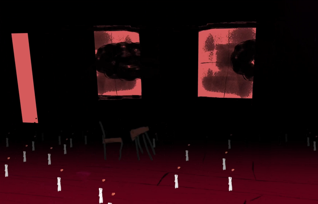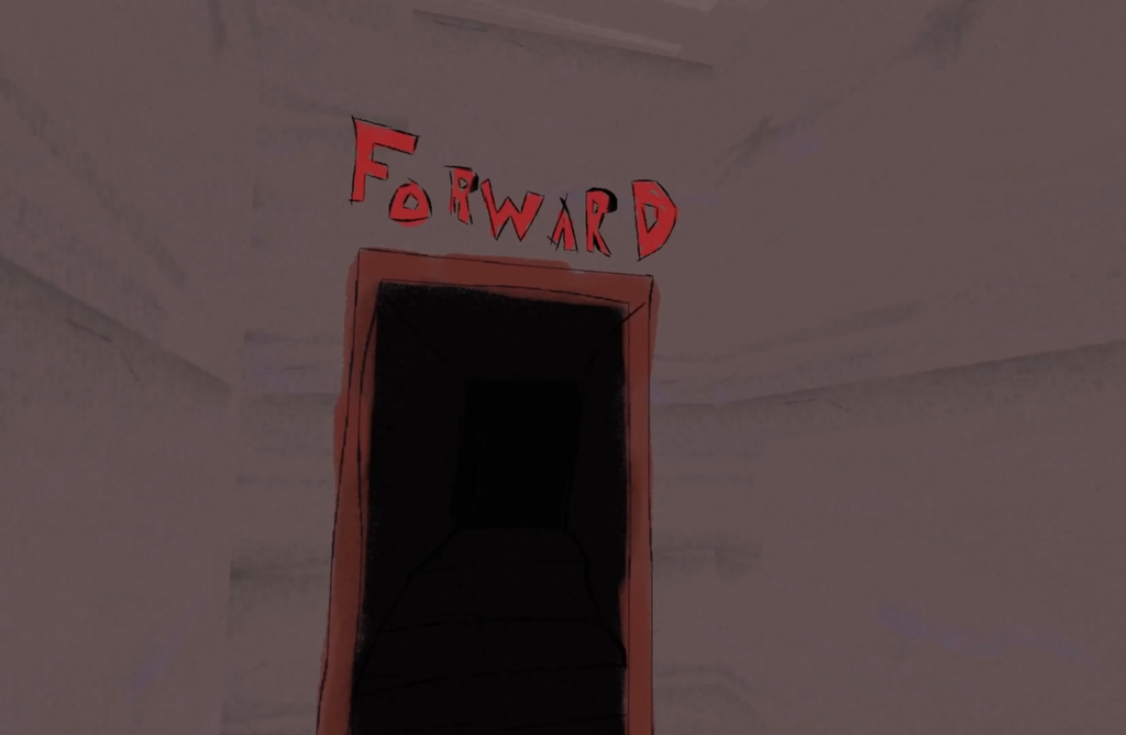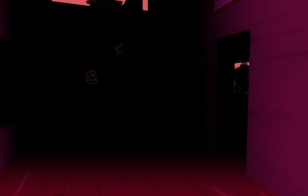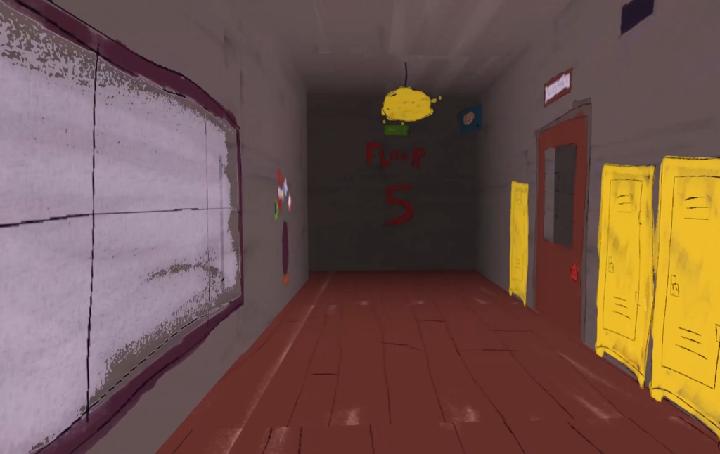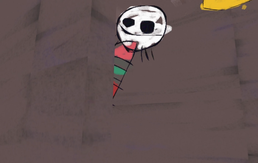 Childlike drawings are all over the environment. Innocent at first. Scribbled figures, uneven shapes, which definitely shows in their simplicity or just funny ridiculousness. So, though, it slowly shifts.